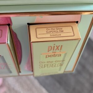Brand new Pixi set of 3 items. Enhance your natural beauty with the On-the-Glow set. This collection includes Blush, Bronze, and Superglow sticks, perfect for adding a touch of pink, bronze, and gold to your look. Easy to apply and blend, these tinted moisture sticks provide a radiant finish.