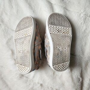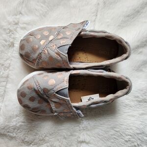 Adorable and stylish, these TOMS Bimini shoes feature a fun rose gold foil polka dot design on a soft drizzle grey canvas. Designed for comfort and convenience with a Velcro closure for easy on and off.