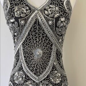 This stunning black and silver dress features intricate detailing and a sophisticated design, perfect for any special occasion. Full separate liner dress for comfort