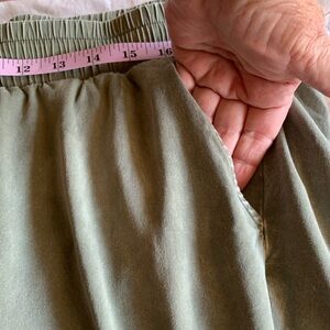 Washed and worn once …Super cute for summer acid wash tie front pant, ( jogger style )lite army khaki two front slit pockets , two cargo pockets, soft banded bottoms very versatile. 97%rayon 3% spandex fabric is distressed wash so there is color variation