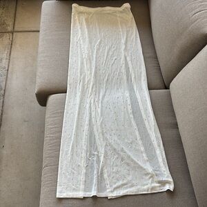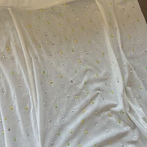 Like new, worn once briefly, clean long white mesh and rhinestone skirt. Elastic waist. No stones missing and no snags. Split front for both legs. Measures 42” long and split length measures 28” long