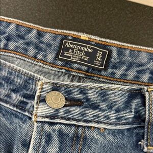 These Abercrombie & Fitch jean shorts showcase a vibrant blue hue with charming floral embroidery along the sides. The distressed and frayed edges add a trendy, laid-back vibe perfect for summer outings.