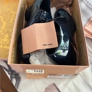 These Miu Miu lace-up boots in blueberry blue are crafted from glossy patent leather, featuring a stylish chunky heel and a rounded toe. The eyelet lace-up design adds a touch of sophistication, making them perfect for a polished, dressy look. Ideal for elevating any outfit, these boots are a chic addition to your footwear collection.