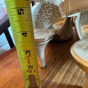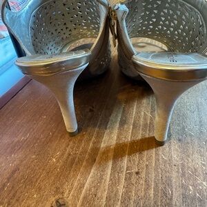 Bandolino , Goldish Heels with A Pretty Design Size 7.5. Elevate your style with Bandolino's gold heels, featuring a sophisticated perforated pattern that adds elegance and breathability. These heels are perfect for any occasion, combining comfort with a touch of glamour. Summer Wedding, π Summer Party, Engagement party. Any Occasion. ππΊπΈβοΈπΊπΈππ₯π₯π₯π₯