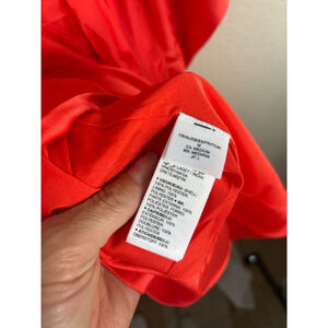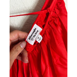 This is a Jalisaevaughn The Drop Fiesta cowl dress, size medium. The dress is bright red and made of 100% polyester. It features thin straps and a draped, asymmetrical design. The dress is new with tags and comes in its original packaging. There are no visible imperfections. The dress is made in India.