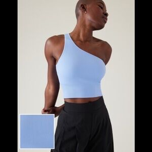 New with tag Athleta Aurora seamless one shoulder tank in the color powder blue. Ribbed texture stretch and no built in bra or cups. Box A