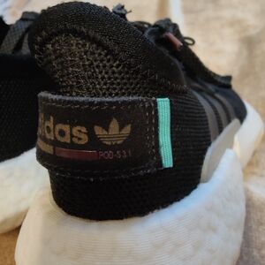 Styled for women, the adidas Wmns P.O.D. S3.1 'Core Black' sneaker blends a 90s aesthetic with modern Boost cushioning. Dressed predominantly in all-black, this shoe features a sock-like fit constructed from a knit textile upper with TPU overlays. A lace closure with an elastic bungee on the tongue reinforces the snug fit, while tonal Three-Stripes branding and a hit of turquoise at the heel strap accents the shoe. A two-tone P.O.D. System midsole with a podular Boost heel and sculpted rubber outsole delivers cushioned flexibility underfoot.