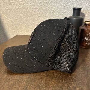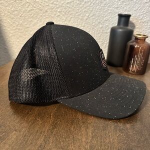 Stylish black Travis Mathews trucker hat with a logo patch. Features a speckled design.