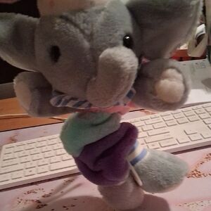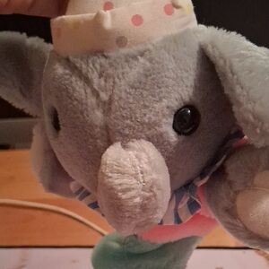Delight your child with this adorable elephant plush toy. 8 inches sitting and 18 stretched out. when you pull it it sings "you are my sunshine tune. It's from kid2 1993