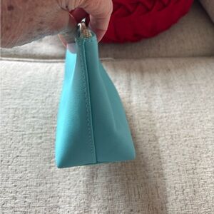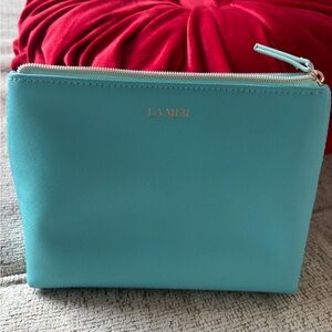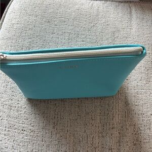 Add a touch of luxury to your beauty routine with this elegant La Mer zippered cosmetic pouch in a fresh teal color.