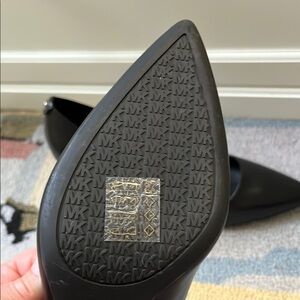 Step into sophistication with these black heels from Michael Kors, featuring a sleek pointed-toe design and a medium-height stiletto heel. The smooth, glossy finish adds a touch of elegance, making them ideal for formal or business occasions. These minimalist pumps offer a timeless appeal with their clean lines and classic silhouette.