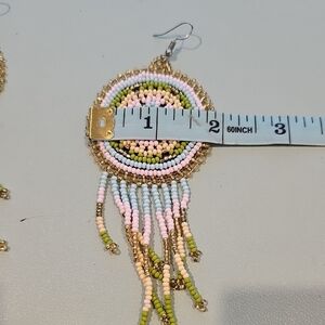 Add a touch of bohemian flair with these colorful beaded fringe earrings. Featuring a vibrant mix of gold, pink, blue, and green beads, these earrings are perfect for any occasion.