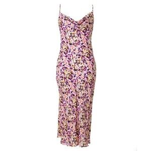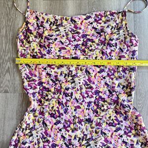 This vintage Diane Von Furstenberg dress in size 6 is a stunning piece made of 100% silk, featuring a colorful pink, yellow, brown, white and violet geometric print. The sleeveless, spaghetti straps, bodycon style is perfect for various occasions such as beach, travel, parties, or casual days. The sheer silk and midi length add to its boho design, making it a versatile and chic addition to a stylish and luxurious wardrobe