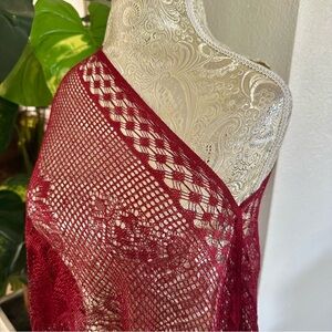 Burgundy shawl with fringe. New, unworn, no tags, sold as is, great condition. This shawl is Ideal for layering! Looks beautiful and luxurious on! Although it is a one size, it fits a large and XL/XXL. You can wear it with a bando top under, jeans or short shorts, heels or sandals. You can even pair it with a cowboy hat and chunky gold jewelry. This is a super cute shawl! Wear it poolside, day parties, beach, vacation, bohemian, festival, Coachella, Ibiza, day events, rooftop, Spanish look, Miami. This is a unique look with a sexy edge! A must in your closet!