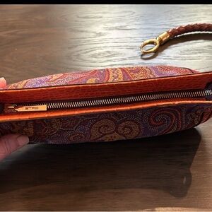 Elegant Etro bag with vibrant paisley design. Features rich red, purple, and gold tones. Perfect for adding a touch of luxury. See pictures for condition and as part of description. Slight tarnish on end of strap on metal. I did get most of it out so not really bad. Please ask all questions prior to purchase. Thank you
