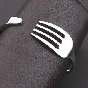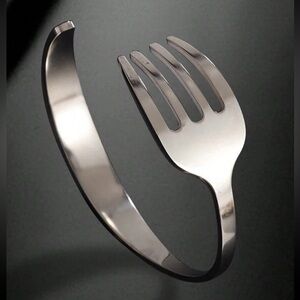NWOT: This unique bracelet features a stylish fork design, crafted in a sleek silver finish. Perfect for adding a touch of whimsy to any outfit.