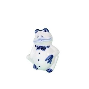 Delft Blue style ceramic frog figurines capture a whimsical charm with their classic blue and white hand-painted aesthetic. This pair includes one frog lounging comfortably and another sitting upright, both adorned with dapper bowties and intricate windmill scenes on their backs. These miniature sculptures serve as delightful decorative accents for a shelf, tiered tray, or as a unique gift for collectors of amphibian-themed decor or Dutch-inspired pottery.