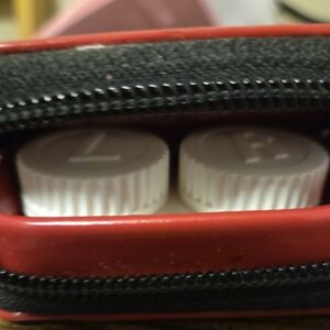 Stylish Coach contact lens case and a contact holder inside . Features leopard print with bold red trim. Compact and chic design.