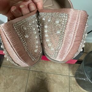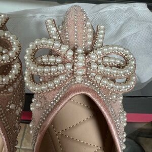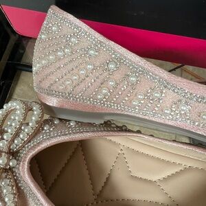 Step out in style with these elegant pink flats Adorned with a charming bow and delicate pearl details, these shoes are perfect for any occasion. The soft pink hue adds a touch of femininity to your outfit.