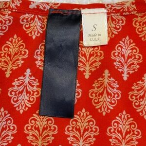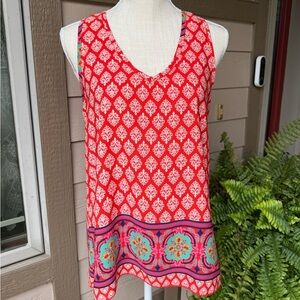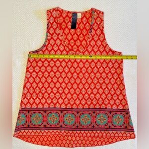 This vibrant orange tank top features a sleeveless design and a scoop neckline, perfect for warm weather. The lightweight fabric and eye-catching white geometric pattern add a touch of retro charm to your summer wardrobe. The boarder adds the vibrant colors of summer.