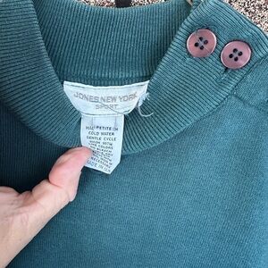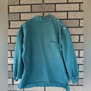 teal, oversized sweatshirt by Jones New York. It features a mock neck and decorative buttons on one shoulder. There is also a small pocket on the front chest area.