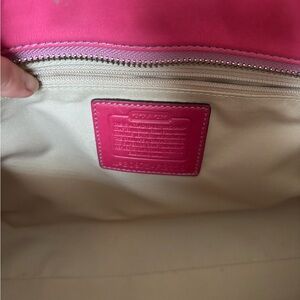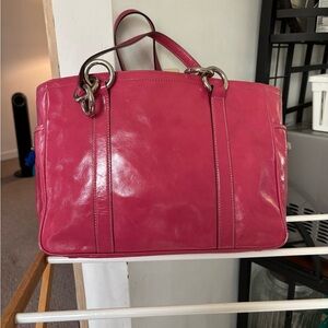 Coach Pink Shoulder Bag with a glossy finish. This structured bag is designed to maintain its shape, making it a reliable choice for everyday use. Slight wear on the corners can be seen in the last two pics.