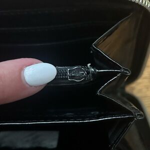 Call outs: see pics. Small spot of exterior black shine has rubbed away. Interior zipper is functional, but missing zipper pull.