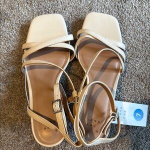 Elevate your summer wardrobe with these chic cream sandals from A New Day. Featuring a strappy design and a low heel, they offer both style and comfort for warm-weather outings. The neutral cream color ensures versatility, making them a perfect match for any outfit. Approximately low 2inch heel, straps around the ankle.