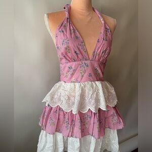 Flirty mini dress with floral print. Halter neck and tiered lace design. Ideal for a fun outing.