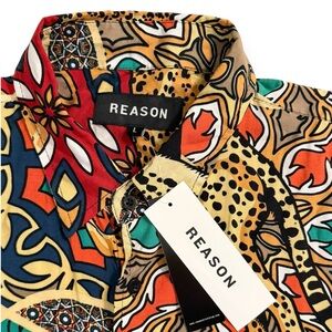 The Reason Monteverde shirt is a distinctive, custom-designed button-up shirt featuring medallion and animal prints, part of the Reason clothing line.