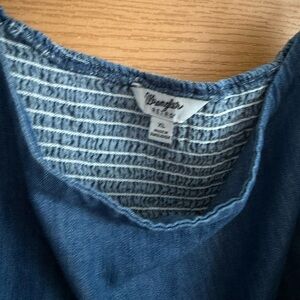 Stylish tiered denim dress by Wrangler. Perfect for casual outings. Comfortable and chic design.