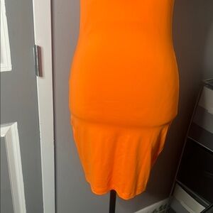 Bold orange dress with spaghetti straps. Sleek and stylish design. Perfect for a night out.