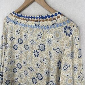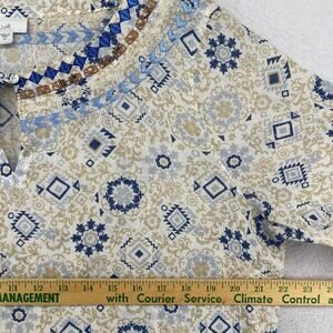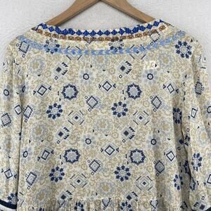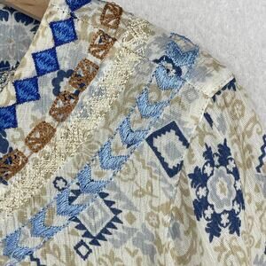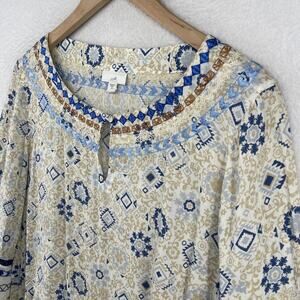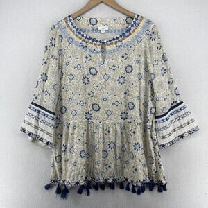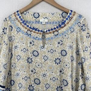 J.JILL Blouse M Boho Tasseled Tunic Embroidered Keyhole Neck 3/4 Sleeve Beige