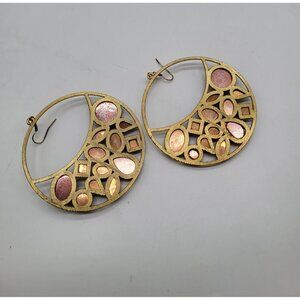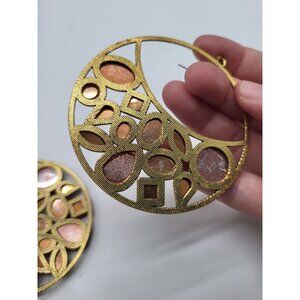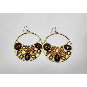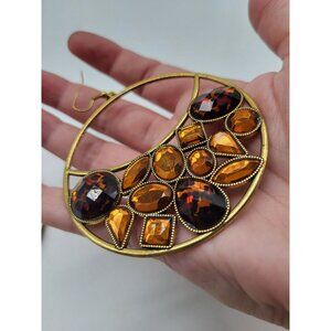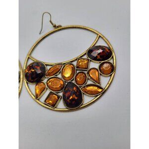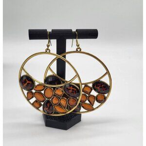VTG Leopard Amber Honey Gold Tone Huge Hoop Dangle Earrings Costume Runway