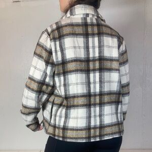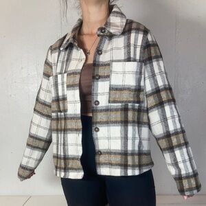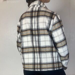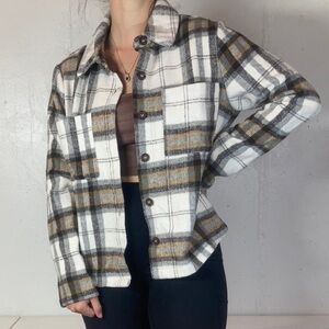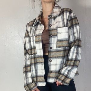 Super cute neutral plaid shacket in white, tan, gray, and black. Vintage brushed wool cozy look in a slightly cropped boxy silhouette. Big chunky buttons and two chest pockets. Perfect piece for layering on those chilly fall nights when you want something heavier than a flannel shirt but lighter than a full coat. Length is