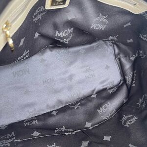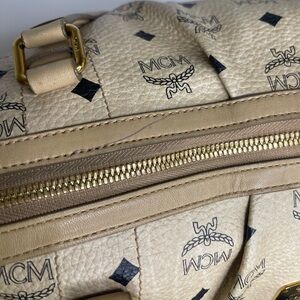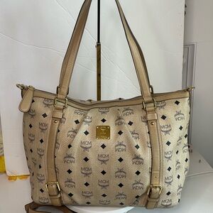 Stylish MCM 2 way shoulder bag in beige with iconic monogram print. Features durable straps and gold-tone accents.