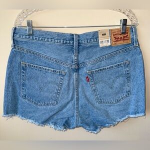 These Levi's jean shorts are crafted from medium-wash blue denim, featuring a high-waisted design with a trendy distressed look. The raw, frayed hems and cut-off style add a casual, worn-in vibe, perfect for a laid-back day.