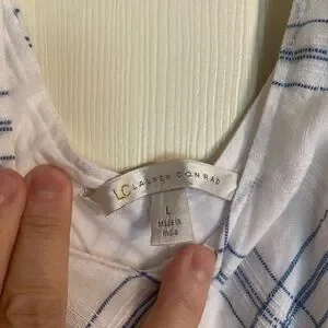 This elegant sundress by LC Lauren Conrad features a sleeveless design with a v-neckline and a chic tie front detail. The asymmetrical hemline adds a modern twist to its classic gray and white color palette, making it perfect for cocktail parties or as a wedding guest outfit. The light, flowing fabric ensures comfort and style for any formal occasion.