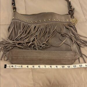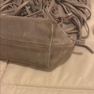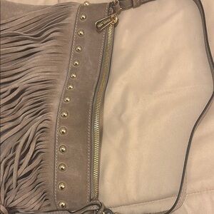 LIKE NEW! PERFECT FOR FESTIVAL SEASON! This tan shoulder bag by MICHAEL Michael Kors features a bohemian-inspired design with dramatic fringe details. Its slouchy silhouette and cohesive suede material make it a versatile accessory for any occasion. Only used a couple times. No stains inside or tarnish on gold emblem or zippers. Just very minor darkening on bottom corners as shown in pictures. $90 OBO!!! Need it gone from my closest!
