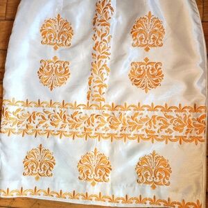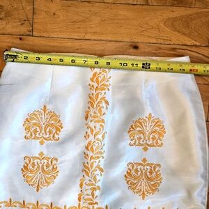 This pencil skirt is a beautiful white linen look material that has a gorgeous sheen to it. The embroidered details are a golden orange color and look like something from a far away land, very eclectic and unique.