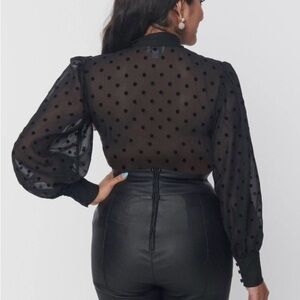 Unique Vintage Black Flocked Polka Dot Tie Neck Gwen Blouse