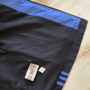 Adidas jacket with a bold blue and black design. Features a high collar and zip closure.