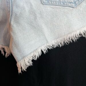 These PacSun festival shorts feature a light blue wash with distressed details, a raw frayed hem, and a flattering high-rise fit. Made from sturdy 100% cotton denim—perfect for casual summer days and concert-ready looks.