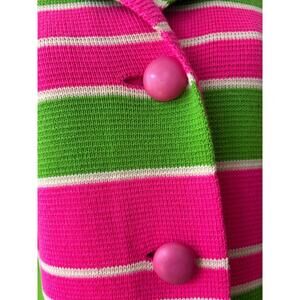 Neon pink, green and ivory wool knit cardigan sweater coat. With large pink wooden buttons down the front, fully lined. 1960s Sebastian label, made in Italy.