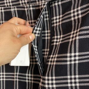 Stylish black and white plaid skirt with button details. Perfect for any occasion.