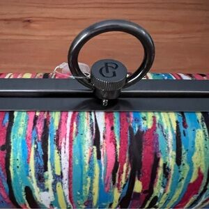 Vibrant clutch with bold colorful stripes. Gorgeous black and white interior floral lining. Includes a sleek chain strap if you want to wear it over your shoulder or can be tucked inside if you want to use it as a clutch. Snap closure .