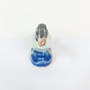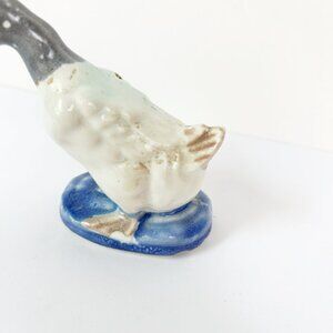 This vintage ceramic hand-painted duck goose figurine stands at 3 inches tall, making it a charming collectible piece suitable for mid-century modern enthusiasts. Crafted from porcelain, this handmade figurine features a unique hand-painted design that adds to its nostalgic appeal. Perfect for bird lovers or collectors of vintage items, this figurine is a whimsical and decorative addition to any space.