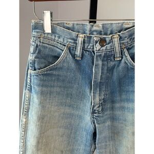 Step back into the golden era of '60s/'70s Americana with these authentic Wrangler flared-leg jeans. Crafted in the USA with a durable Talon #42 zipper and artfully repaired knees, they blend time-honored quality with vintage character. With a 24″ waist, 11″ rise, and 28″ inseam, they offer a comfortable high-waist fit that flatters every silhouette.