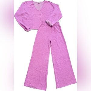 The Sincerely Jules Purple set is a stunning piece that combines elegance with comfort. Crafted in a soft, flowy fabric, it features a high-waisted design and a relaxed fit through the legs, making it perfect for any occasion. The jumpsuit's minimalist style and consistent color offer versatility, allowing it to be dressed up or down effortlessly.