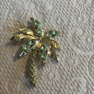 Elegant gold palm tree brooch with green gemstone accents. Perfect for adding a tropical touch to any outfit. 2.5” high x 2” wide. From a smoke free home. Bundle discounts available and offers accepted.